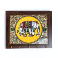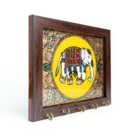 Our exquisite wooden keyholder with elephant art (small) enhances your home decor. This wooden-framed reverse glass Tanjore painting keyholder is crafted from fiberglass and adorned with a vibrant multicolor design. Perfect for organizing your keys while adding a touch of elegance to any room, its sturdy construction ensures longevity, making it a valuable addition to your home.