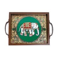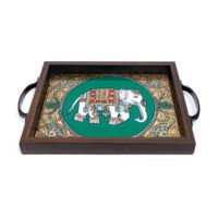 Our exquisite reverse glass tray features stunning elephant art. This tray, framed in wood and adorned with vibrant multi colors, is perfect for holding kungumam, vibhuti, and betel leaves during ceremonies. Its elegant design and sturdy construction ensure it will be a valuable addition to your puja room.