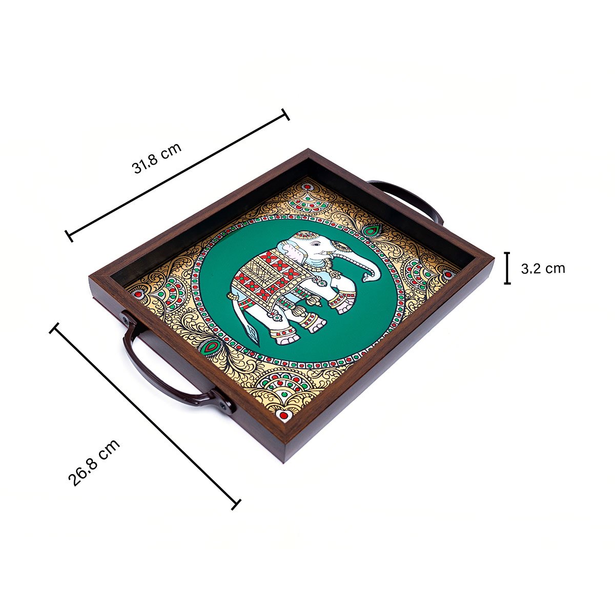 Our exquisite reverse glass tray features stunning elephant art. This tray, framed in wood and adorned with vibrant multi colors, is perfect for holding kungumam, vibhuti, and betel leaves during ceremonies. Its elegant design and sturdy construction ensure it will be a valuable addition to your puja room.