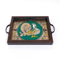 Our exquisite reverse glass tray features stunning peacock art. This tray, framed in wood and adorned with vibrant multi colors, is perfect for holding kungumam, vibhuti, and betel leaves during ceremonies. Its elegant design and sturdy construction ensure it will be a valuable addition to your puja room.