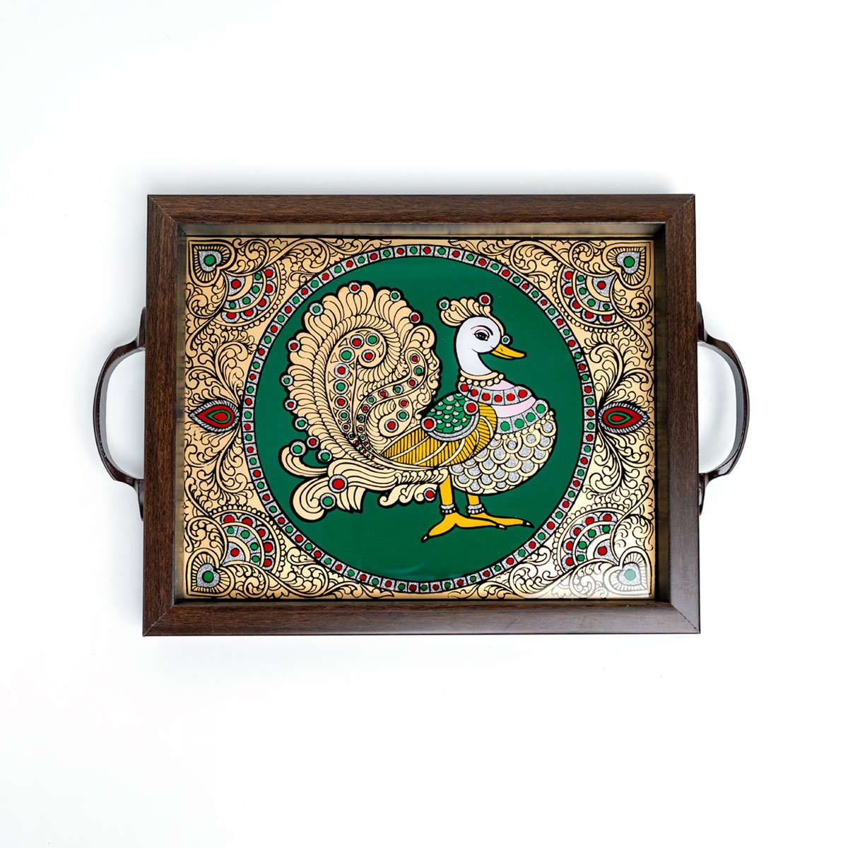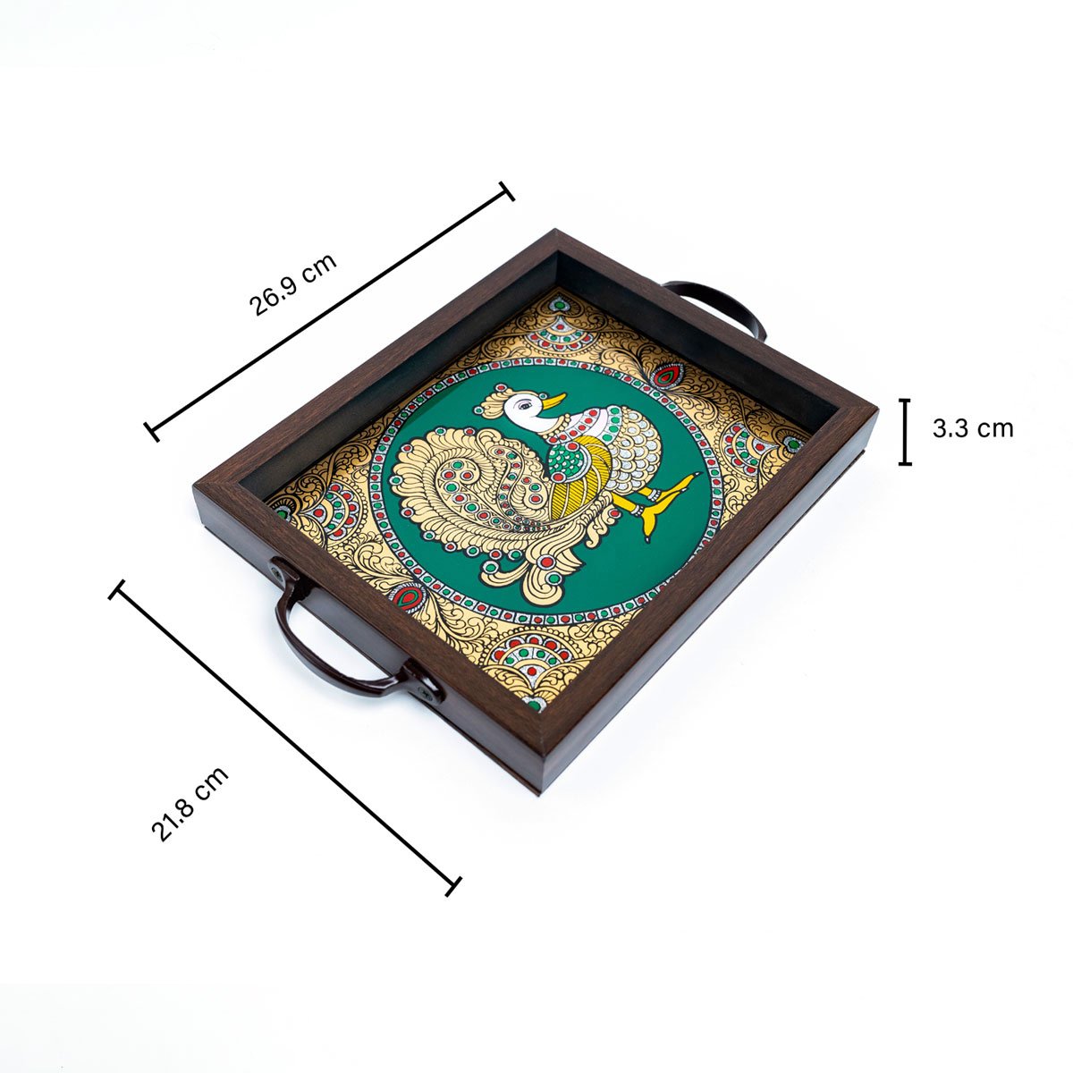 Our exquisite reverse glass tray features stunning peacock art. This tray, framed in wood and adorned with vibrant multi colors, is perfect for holding kungumam, vibhuti, and betel leaves during ceremonies. Its elegant design and sturdy construction ensure it will be a valuable addition to your puja room.