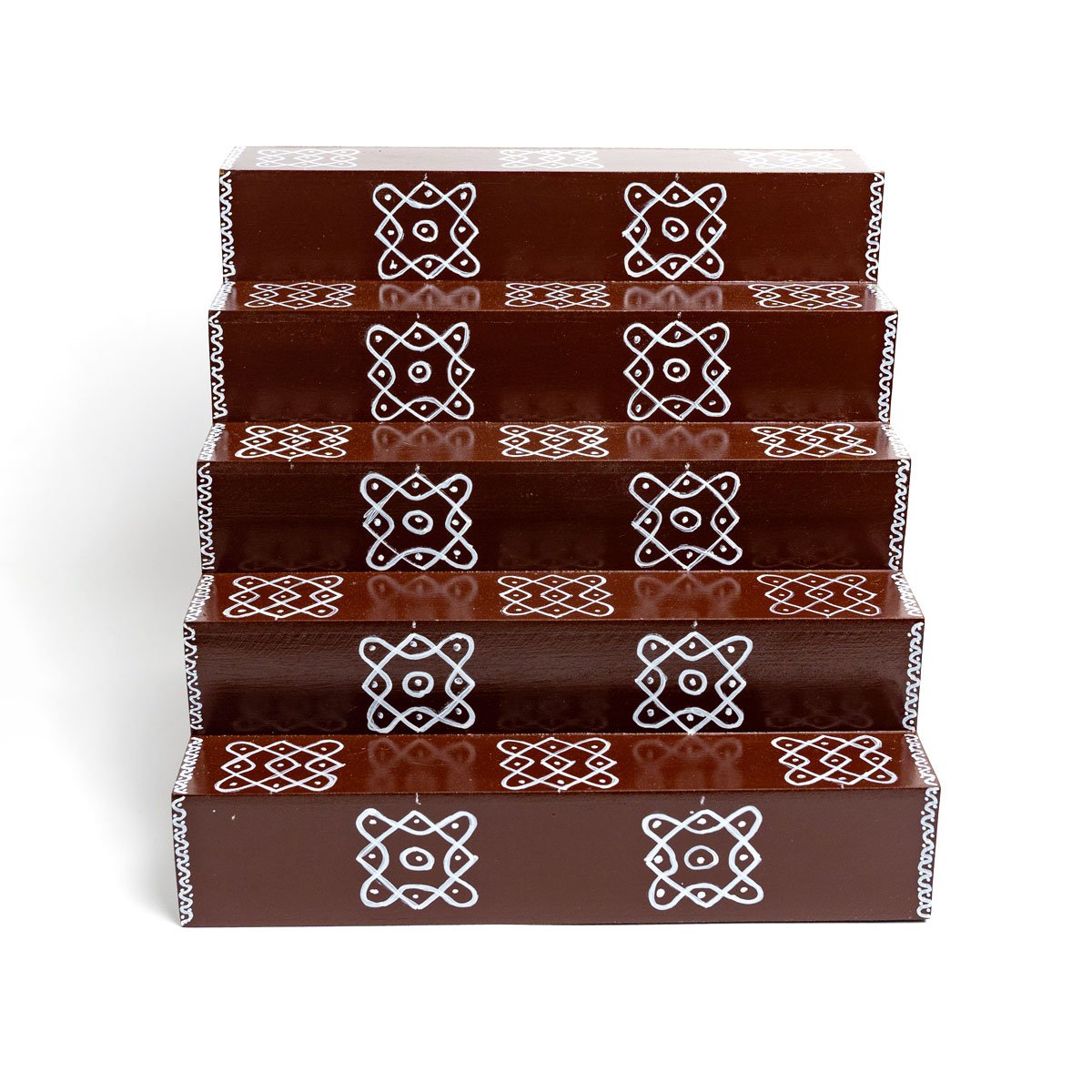 Our exquisite wooden 5 step long steps are made from pure wood and adorned with a vibrant design, this step holder is perfect for lamps, candles and other sacred objects. Its sturdy construction ensures longevity, making it a valuable addition to your puja room.
