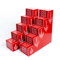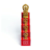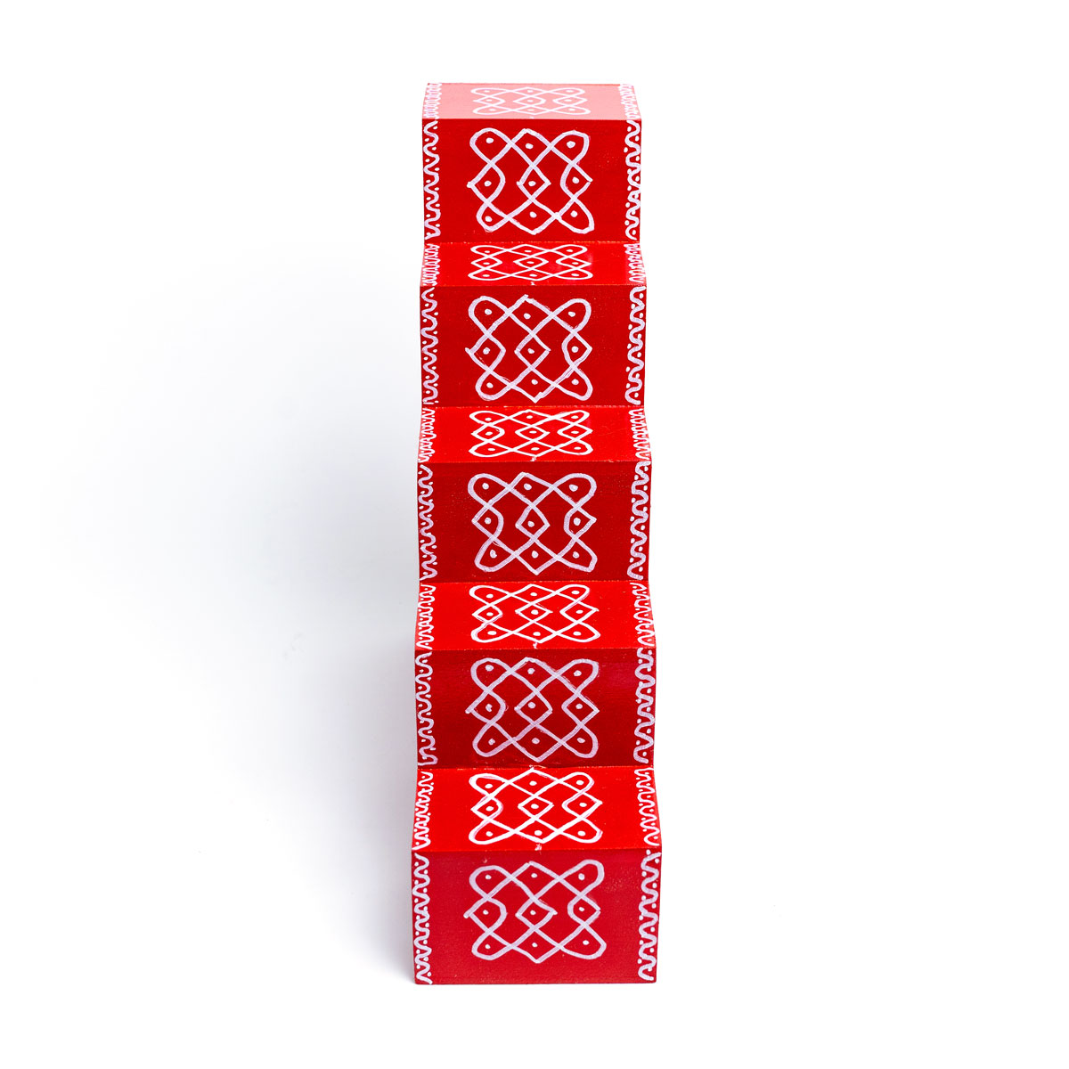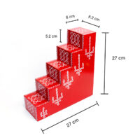 Our exquisite wooden 5 step single pair steps is made from pure wood and adorned with a vibrant design, this step holder is perfect for lamps, candles and other sacred objects. Its sturdy construction ensures longevity, making it a valuable addition to your puja room.