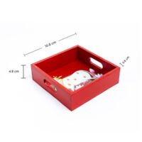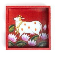 Our exquisite Wooden Pooja tray is made from pure wood and adorned with a vibrant multicolor pichwa design, this tray is perfect for holding puja items, statues, and other sacred objects. Its sturdy construction ensures longevity, making it a valuable addition to your puja room.