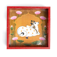 Our exquisite Wooden Pooja tray is made from pure wood and adorned with a vibrant multicolor pichwa cow design, this tray is perfect for holding puja items, statues, and other sacred objects. Its sturdy construction ensures longevity, making it a valuable addition to your puja room.